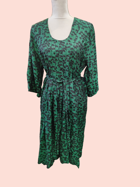 Vintage Seidenkleid L Grün mit Schwarzen Elefanten