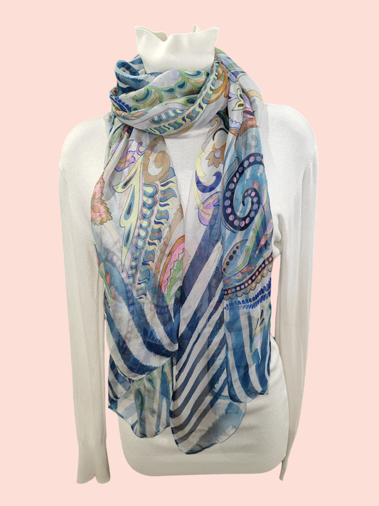 Schal Weiß mit blauen und orangefarbenen Mustern