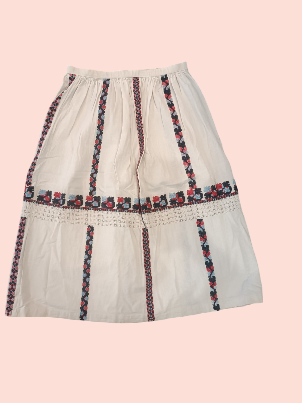 Dieser cremefarbene Rock in Größe M mit wunderschönen Stickereien in Rosa, Schwarz und Blau ist ein echtes Einzelstück. Jedes Detail wurde liebevoll gestaltet, was ihn zu einem ganz besonderen Highlight in deinem Kleiderschrank macht. Mit dem Kauf dieses Secondhand-Kleidungsstücks entscheidest du dich nicht nur für Stil und Eleganz, sondern auch für Nachhaltigkeit und Umweltschutz. Tu der Umwelt etwas Gutes und style dich zugleich zum absoluten Eyecatcher!